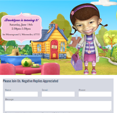 Highlights include: Licensed images; fly-in banner effect with airplane sound; Clicking on the ticket takes guest to a live broadcast of the party - Great for distant family/friends.