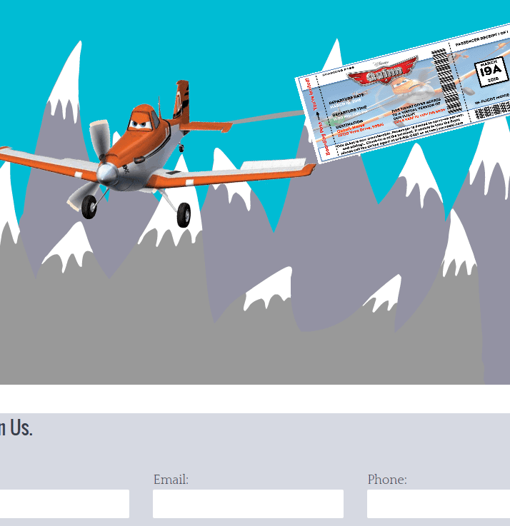 Basic "Planes" theme with licensed use of "Dusty" (available free at Disney's website) The ticket in tow is a replica of the paper invites sent out.